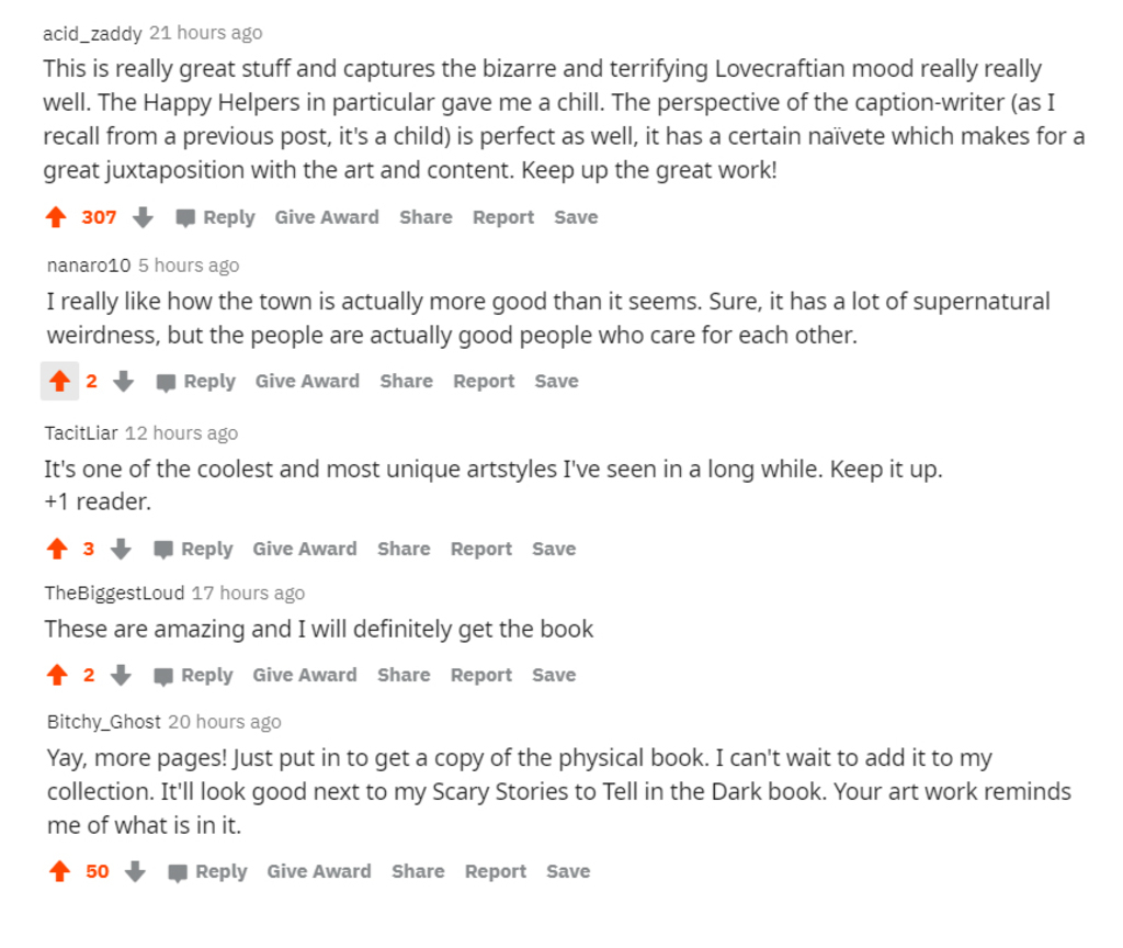 It warms my heart to read people's reviews of my illustrated Lovecraftian book Welcome to Shipsgrave. Probably because so far they are highly positive :) If you want to see what it's all about, read the full book for FREE: https://imgur.com/gallery/ZyCZr1B Or order the physical copy, I'm really close to being able to afford to print it with hardcover: https://igg.me/at/shipsgrave