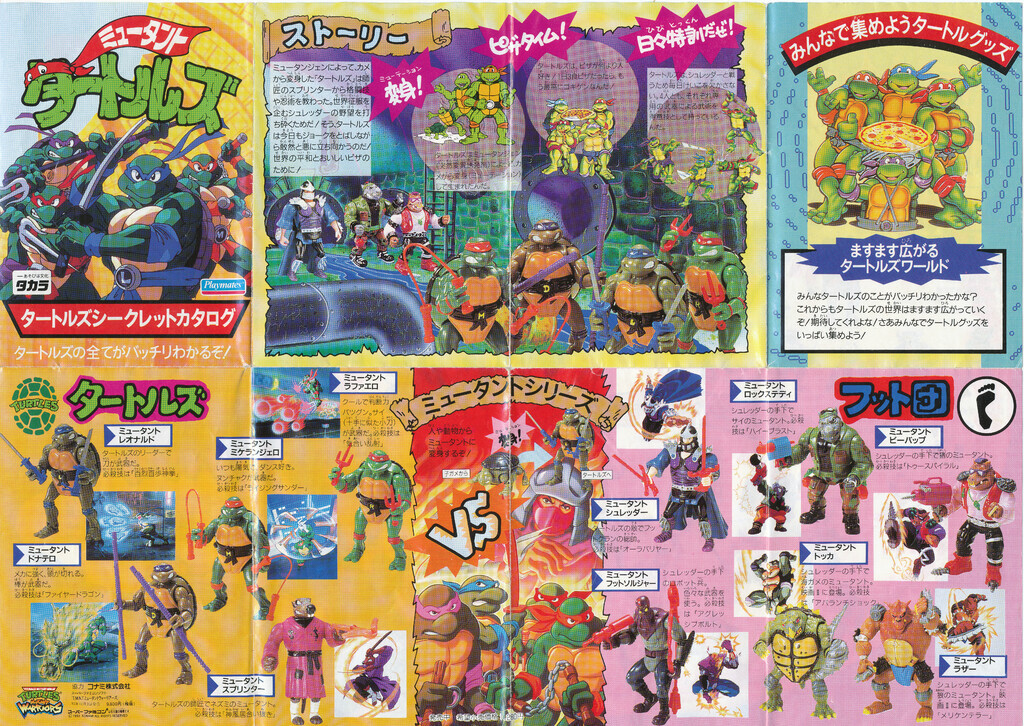 Here's a '94 Takara TMNT pack-in toy catalog promoting the Mutations series. In addition to recycling VHS box cover artwork, the catalog uses artwork from the previously shared Takara CCG, as well as promotional art from Konami's TMNT Tournament Fighters. Good chance the CCG artist and the Konami artist were the same, now that you can see side by side how similar the styles are!