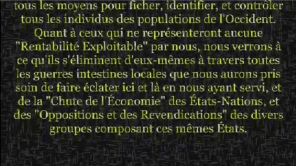 ...tous les moyens pour ficher, identifier, et contrôler tous les individus des populations de l'Occident. Quant à ceux qui ne représenteront aucune «Rentabilité...See more