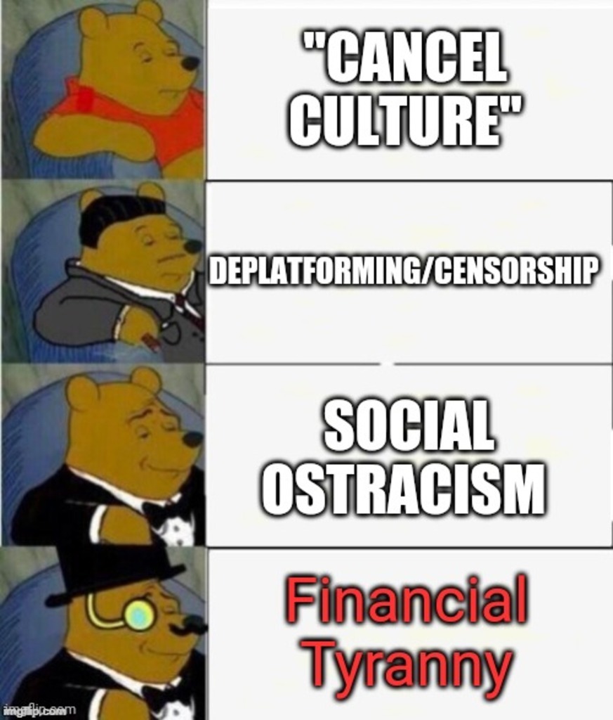 Had a convo with a friend and he introduced me to a term called "Financial Tyranny" which is not only more accurate than the term "cancel culture" but less beating around the bush like "deplatforming".