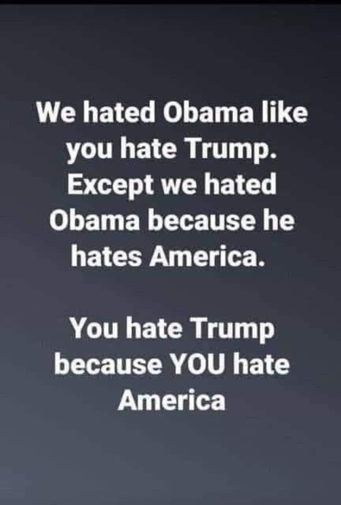 This one says it all. Obama hated America, still does, So we hated him with a passion. You hated Trump with a passion, But .... Trump was a Patriot, he loved America, but your hatred of Trump exposed your hatred of America passionately. All of you, every last one who voted with you as a block. Your all hate mongers.