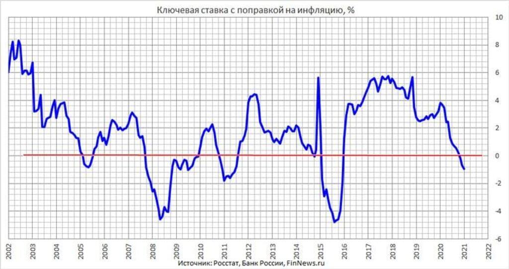 К рассчитываемой инфляции всегда следует относиться скептически, так же как и к попыткам экстраполяции экономической истории. И всё же: из графика видно, что каждое движение ключевой ставки ЦБ в отрицательную область (с поправкой на инфляцию) возникало в кризисные периоды. В 2008...See more