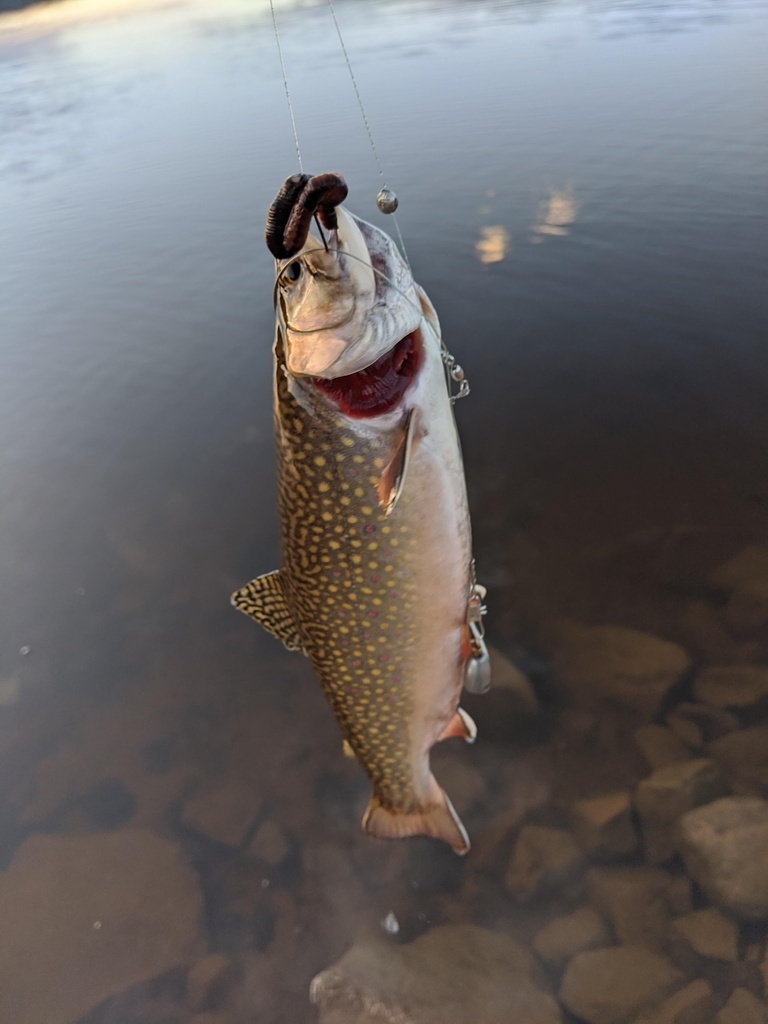 After getting to this new lake pretty late in the afternoon and not being assaulted with mosquitoes we decided to cast in a few lines and see what happens. Within minutes I pulled out this hog of a a trout. My line was rigged up to catch Pike so he ended up getting rapped up in a longer steel leader I had on. I knew I definitely needed to adjust the way my line was strung up if I was going to successfully catch more of these guys.
