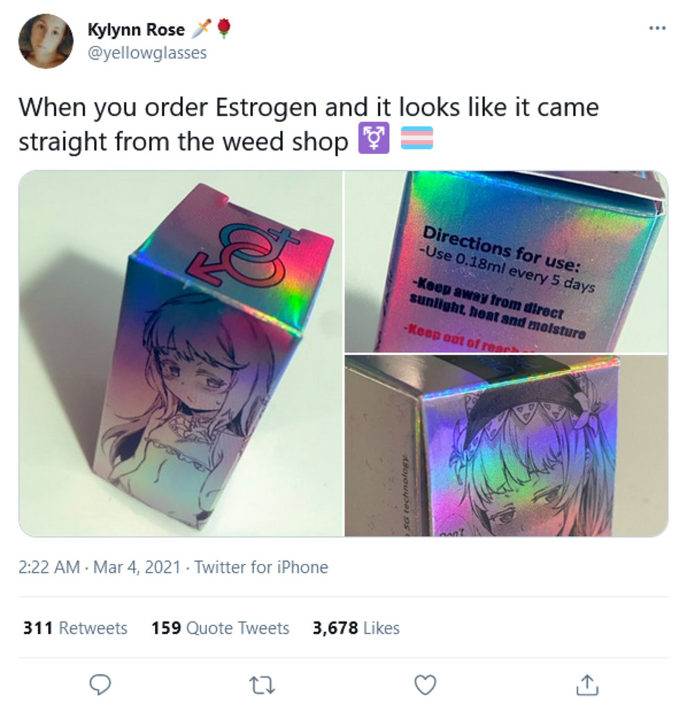 Life altering, body changing medication sold for $46 in a box marketed like a holofoil Charizard card, featuring lolicon/shotacon characters, and stating "keep out of reach of parents" on the side, promoted by weirdos who definitely talk to kids in LGBTQIAP+ Discords.