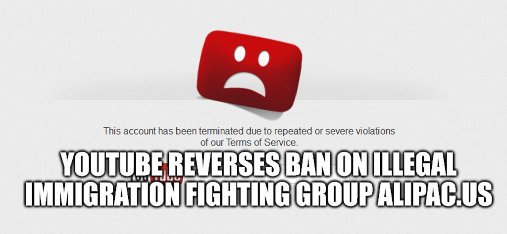 Youtube Reverses Ban on Illegal Immigration Fighting Group "After taking another look, we can confirm that it is not in violation of our Terms of Service" https://www.alipac.us/f8/youtube-reverses-ban-illegal-immigration-fighting-group-383247/