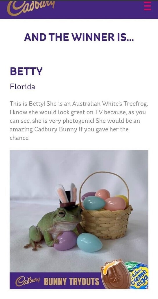 A FROG WON THE CADBURY BUNNY COMPETITION