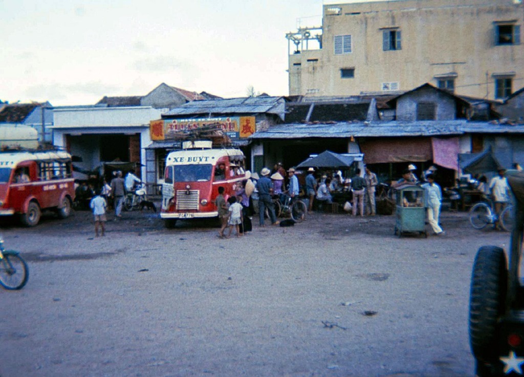 Xe buýt ở Qui Nhơn, chạy các tuyến đường quanh thành phố; kiểu xe được sử dụng là xe Renault Goélette. Nguồn: Thomas J. Robinson (Tom 'Tinker' Robinson).