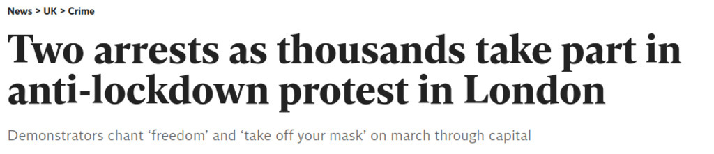 Interesting that The Independent's Zoe Tidman felt it necessary to emphasise the two arrests at today's massive anti-lockdown march in London. Perhaps even more so that this event was listed on the newspaper's website under 'Crime': as she states later in the article, one was for...See more