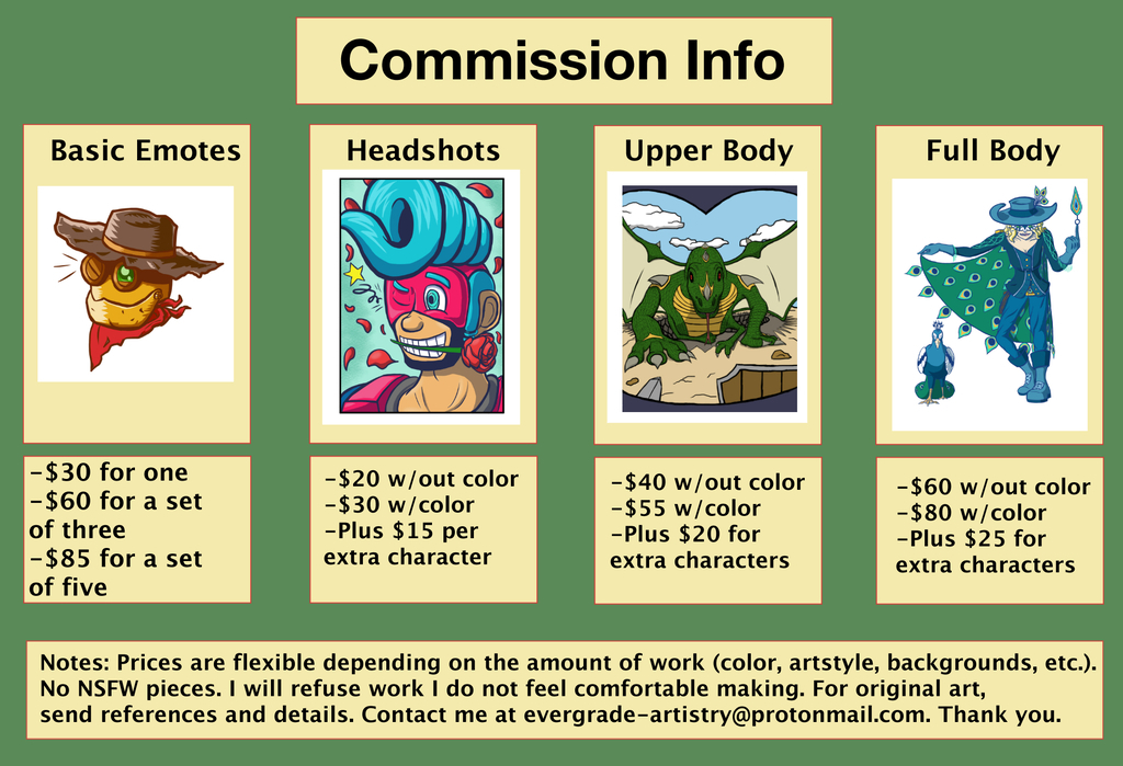 The tweaked version of my commission sheet. As the text says, I'm flexible with prices, and we can discuss details over e-mail. I'm also up for simpler digital sketches. #Commissions #commissionsopen