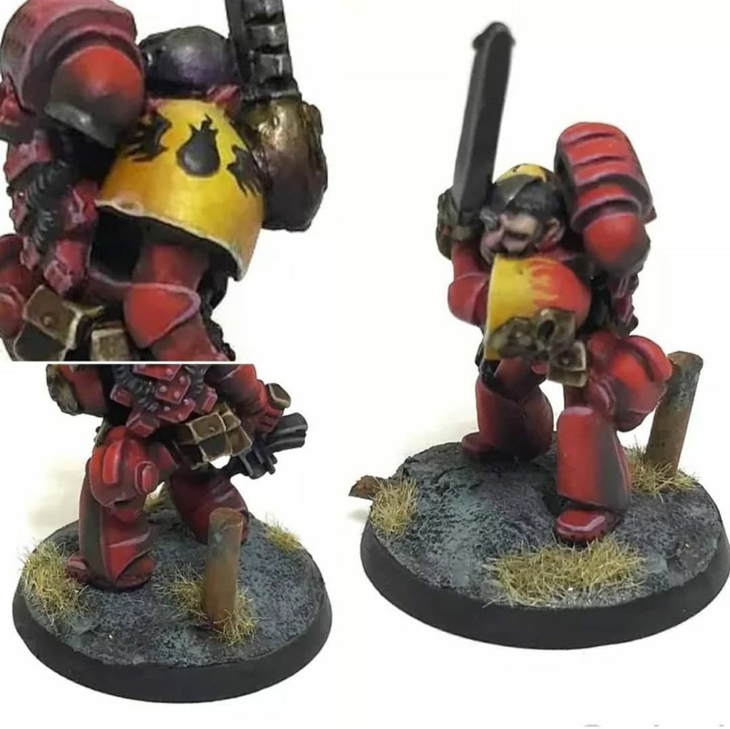 I have fond memories of this guy hitting the battlefield as a Blood Angels sgt back in 3rd edition, during the late 90s. Now he's sporting a fresh (although still red) coat of paint, marking him out as one of the Angels of Fire