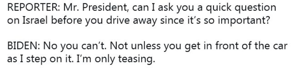 "Репортер: Господин президент, можно задать вам быстрый вопрос про Израиль, прежде чем вы уедете, это очень важно?