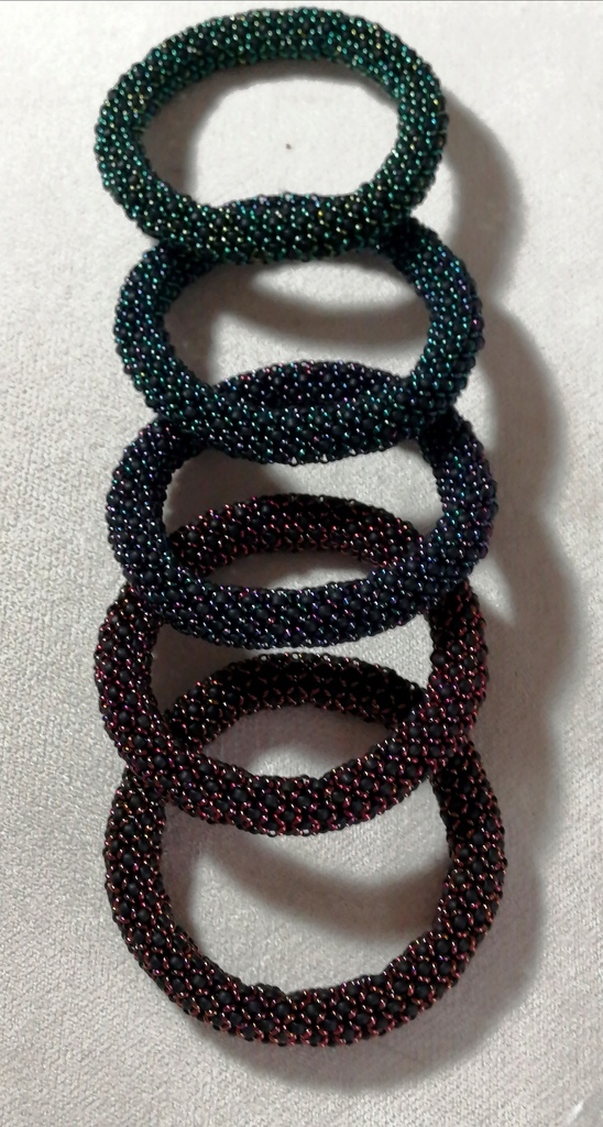 Bangles!! It's been hot and sunny and I wanted a simple project I could work on sitting outside. I've had these beads sitting around for years, so I decided to make use of them. They're done with toho size 8/0 round matte black, with various metallic colours of 8/0 demi rounds. I took a couple of pics while I was working on them that I'll out in the comments below, they're super quick and simple to do. I used fireline to make them solid - I don't recommend Nymo or Toho threads as it's stretchy and they won't hold shape.