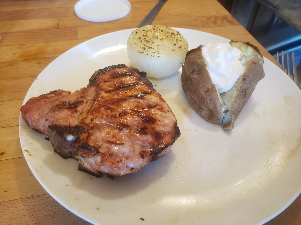 Hawaiian pork chop baked potato and a baked onion