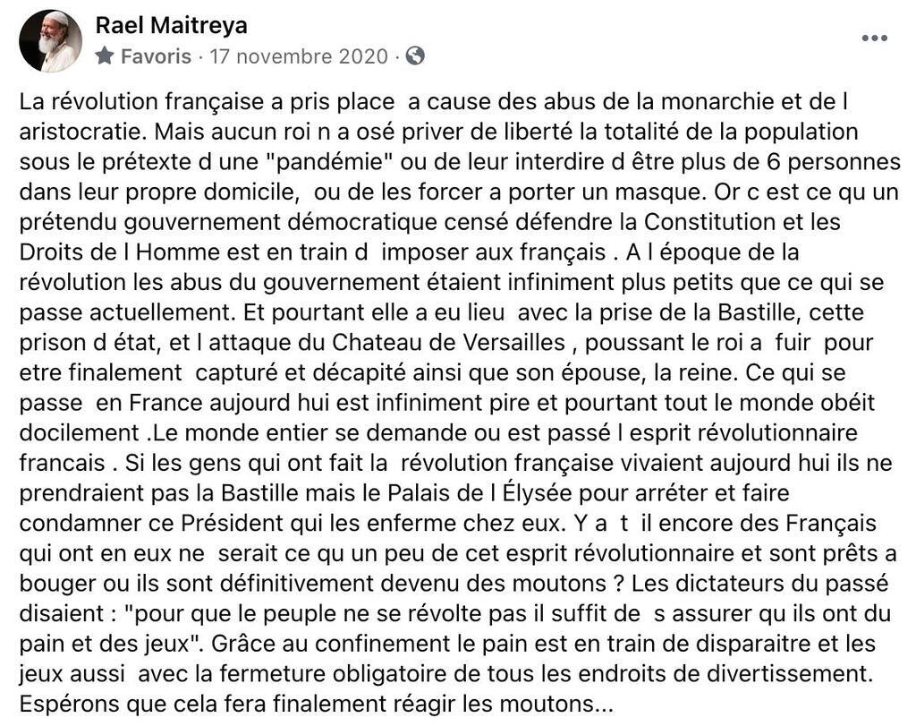 #raelcomment: La révolution française a pris place a cause des abus de la monarchie et de l aristocratie. Mais aucun roi n a osé priver de liberté la totalité de la population sous le prétexte d une "pandémie" ou de leur interdire d être plus de 6 personnes dans leur propre...See more