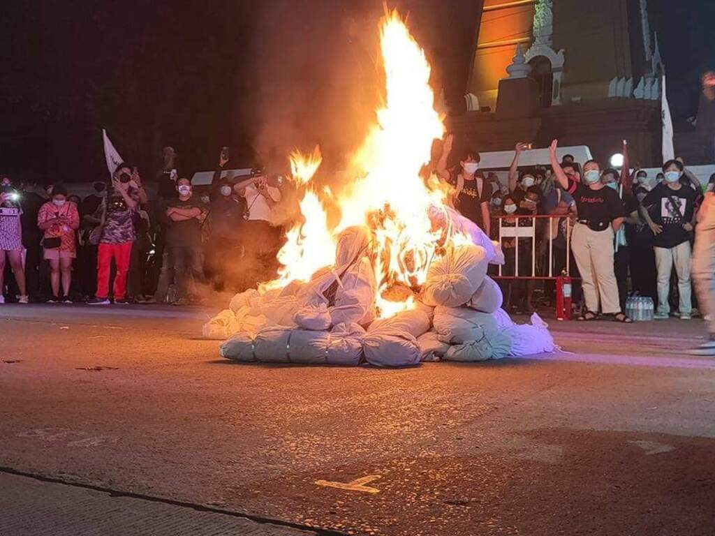 ...งเสร็จสิ้นจุดหมายขบวนเดินรถ มีการเผาหุ่นฟาง โดยขณะเผา ตำรวจประกาศว่าการเผาหุ่นเป็นการกระทำที่กีดขวางการจราจร.