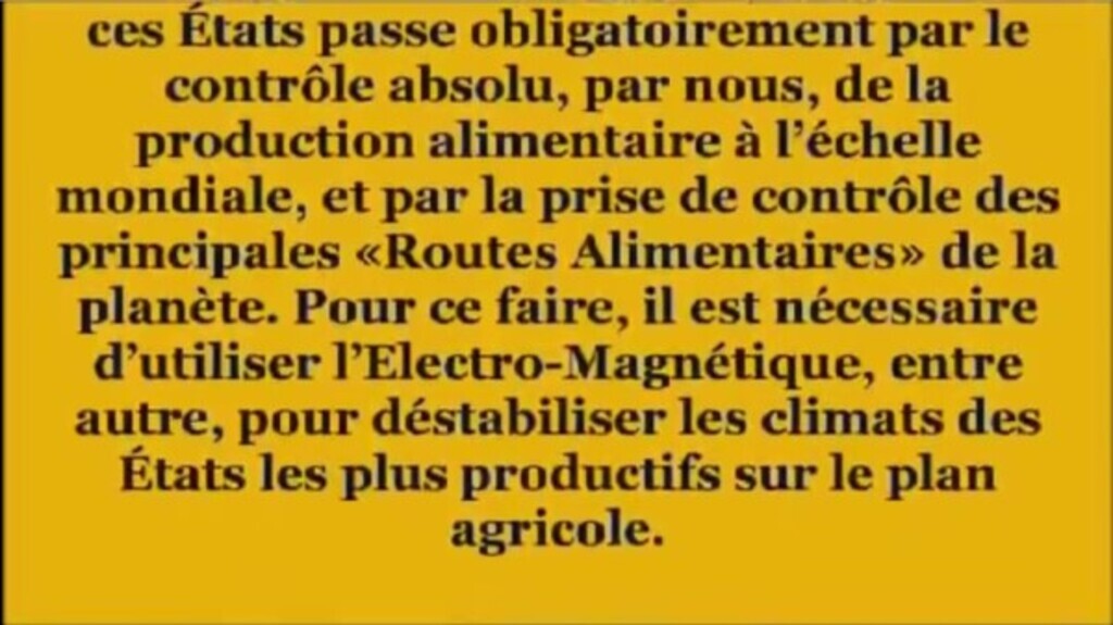 Le contrôle de ces États passe obligatoirement par le contrôle absolu, par nous, de la production alimentaire à l'échelle mondiale, et par la prise de contrôle des...See more