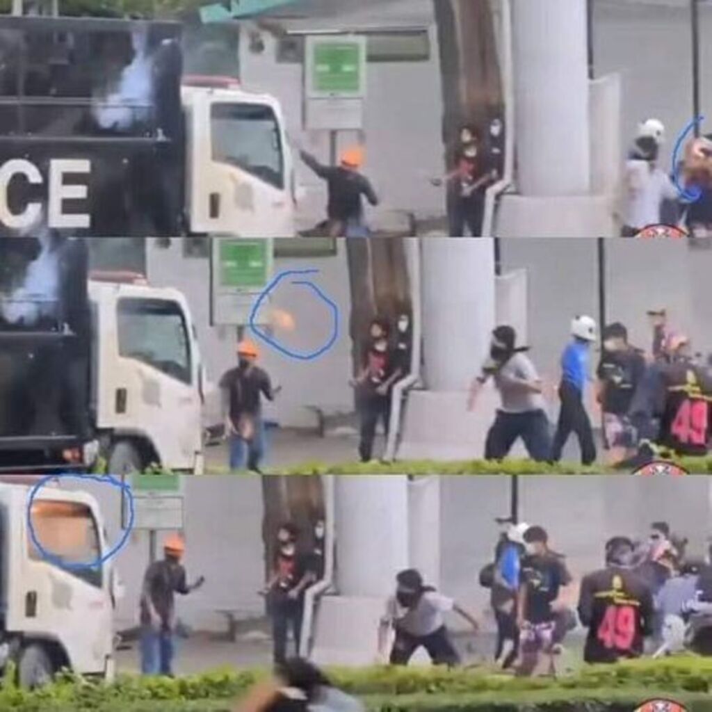 วินาทีชายเสือขาวขว้างวัตถุติดไฟไปที่รถตำรวจ มีชายใส่หมวกส้มร่วมทีม จากนั้นชายหมวกส้ม ก็วิ่งหนีไปทางฝั่งตำรวจ เสื้อขาววิ่งไปในกลุ่มผู้ชุมนุม มันชัดเจนว่ามันทำกันเป็นทีม ใครจะพกวัตถุติดไฟถือเดินในม๊อบคับ ถ้าไม่เตรียมมาเพื่องานนี้