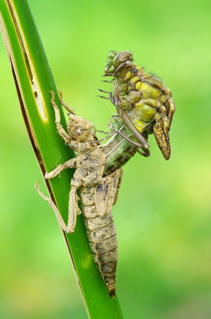 They lay their eggs in plants, and hatch into aquatic nymphs or naiads, which molt between six and 15 times, before transforming into a dragonfly.