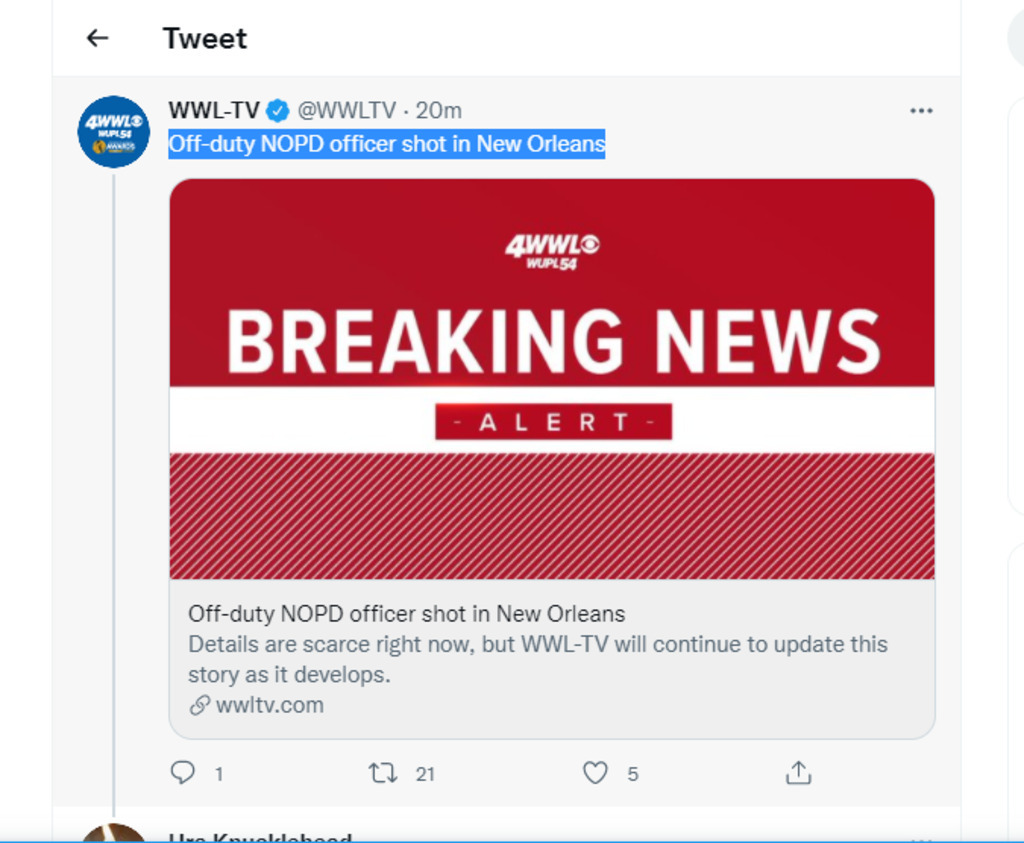 And now, off-duty #NOLA #Police Officer shot 👉via https://twitter.com/i/web/status/1432919440300126213 👈