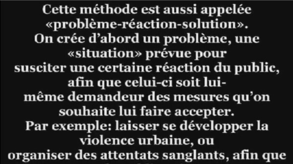 page précédente https://www.minds.com/newsfeed/1282174148663054353 Source https://odysee.com/@6aircyan:7/LE-PLAN-SECRET-DES-ILLUMINATI-EXPOSE-(COMPLET):2?r=8r1ytyFxQAVeLuBYGFuZHhGpGVWc7Lzz&t=3008 Cette méthode est aussi appelée «problème - réaction - solution». On crée d'abord...See more