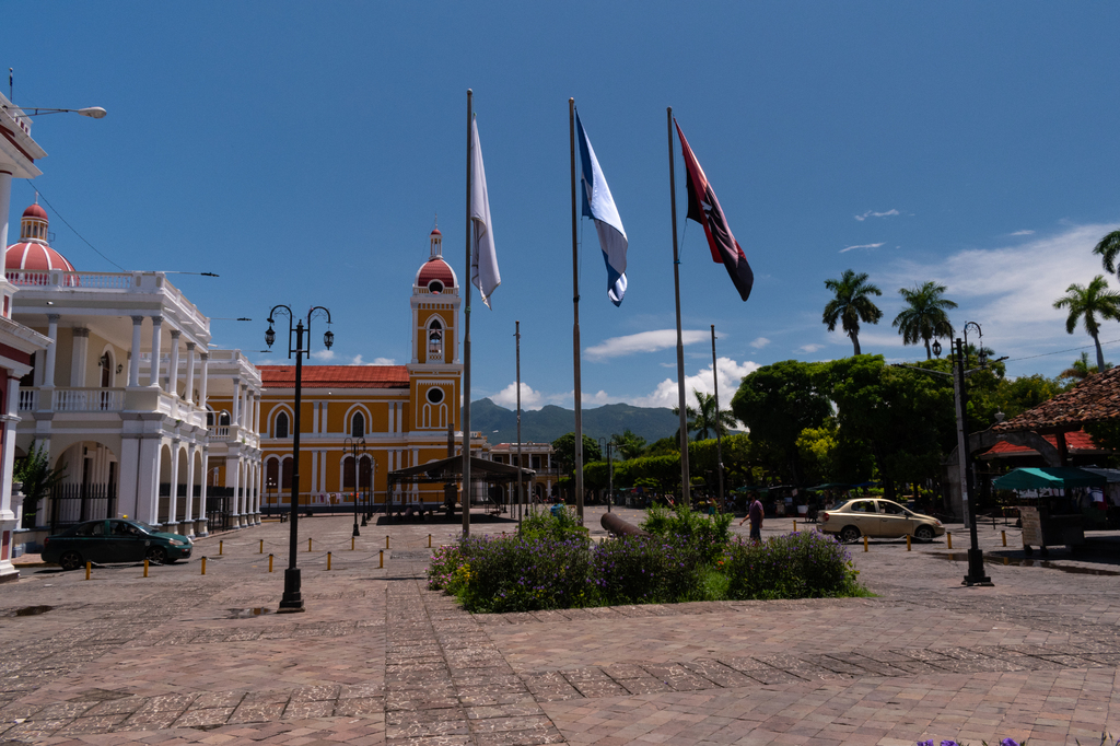 The main plaza in Granada, Nicaragua, with the volcano peak in the distance behind the cathedral.