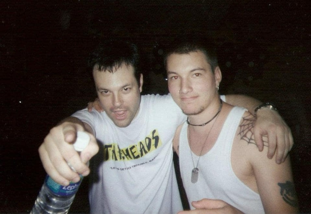 1999 photo, seen on the internet -- I still have that Tapeheads shirt. Water instead of beer is rather unusual in such photos. #minds