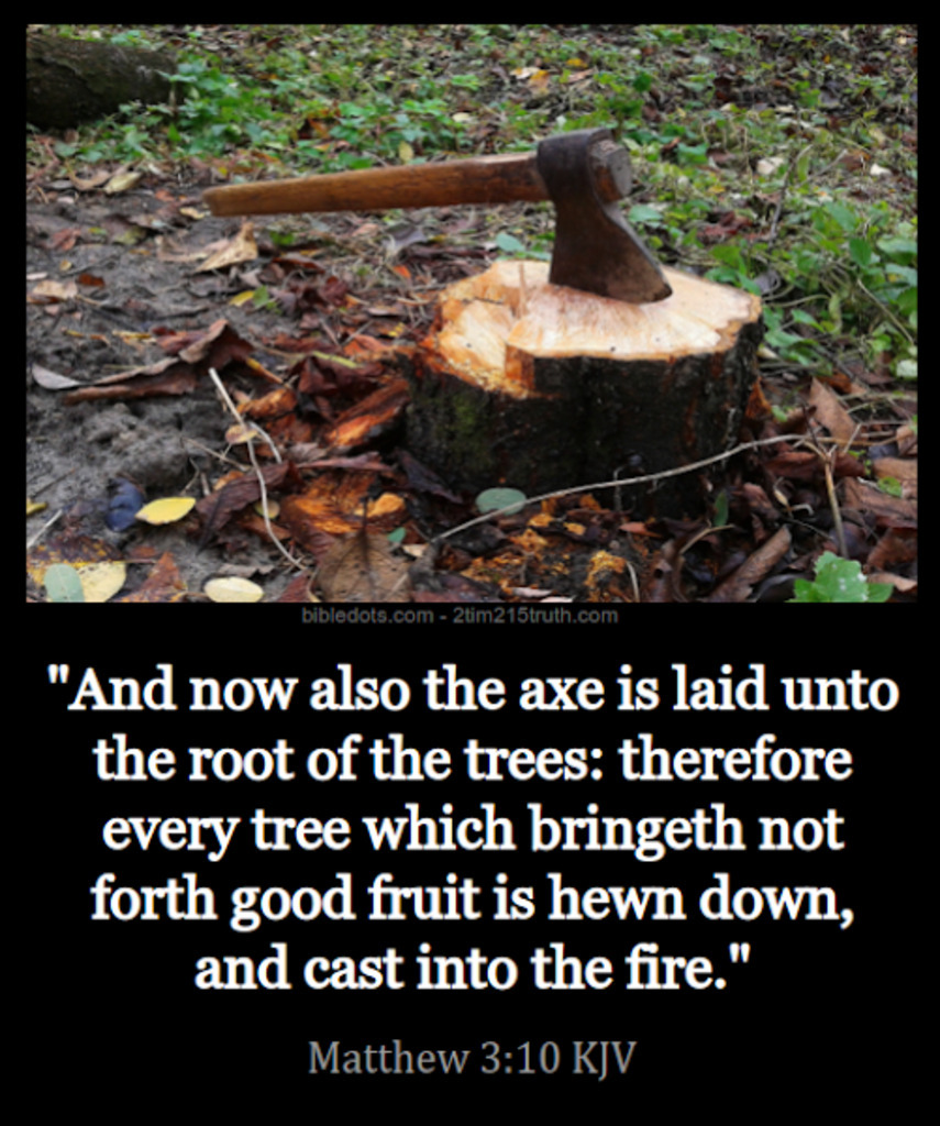 "And now also the axe is laid unto the root of the trees: therefore every tree which bringeth not forth good fruit is hewn down, and cast into the fire." - Matthew 3:10 KJV