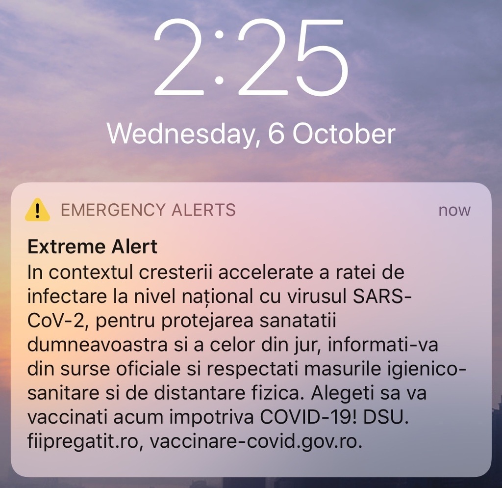 6 octombrie, ora 2.25 ziua... dintr’odată telefonul urlă cu alarma de pe sistemul de avertizare națională. Văd titlul: alertă extremă. Îmi stă inima’n gât. Vine un cutremur imens? Invadează rușii? Au atacat chinezii Taiwanul și vin rachete nucleare spre Deveselu? Stai chill, bro’. Un gunoi de la DSP vrea să facă promoție la vaxinare și la câteva site-uri... Nici pînă acum nu ‘mi-a scăzut pulsul... Cineva trebuie dat afară. #DSUconcediat