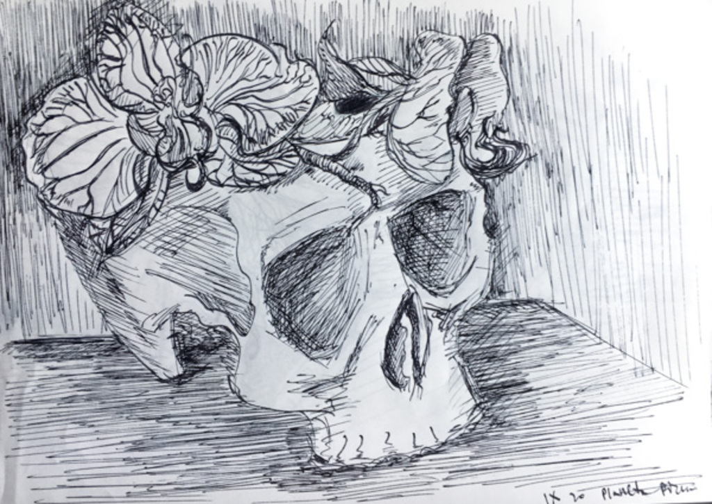 Good evening Minders. I post my sketches in black ink on thin paper. Today a skull (plastic, not real; P) plus orchid flowers (Orchidaceae), which gradually fell to the ground and the table. I had to use them. Give meaning to their sad act.