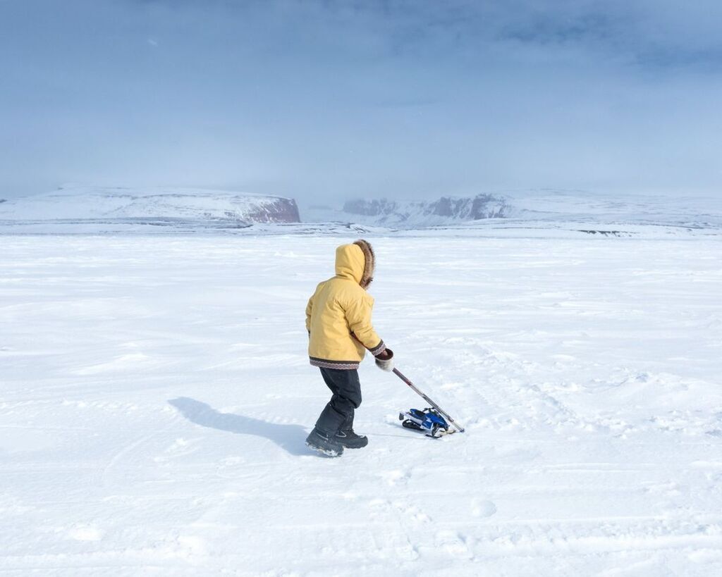 Photo by acacia.johnson / A boy pulls a toy snowmobile over the sea ice near Arctic Bay, in Canada's Nunavut region, on a break during a nine-hour snowmobile trip to a fishing lake. Every year, the Inuit community of Arctic Bay—called Ikpiarjuk in Inuktitut—holds an ice fishing...See more