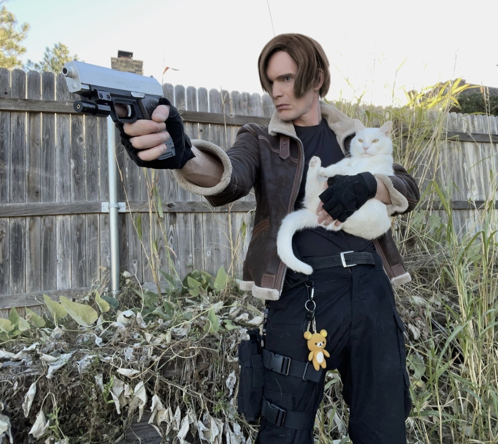 A little preview of my redone cosplay of RE4 Leon. I’ve been using apps to improve the hair color and eye color. Stay tuned for more from me. Let it also be known from now on that this Leon is the Defender of the Kitties. 😏 Be sure to also “Follow” me on IG right here. https://www.instagram.com/tylertouchdowncosplay/ #residentevil #residentevilleon #residentevil4 #residentevilcosplay #kittylove