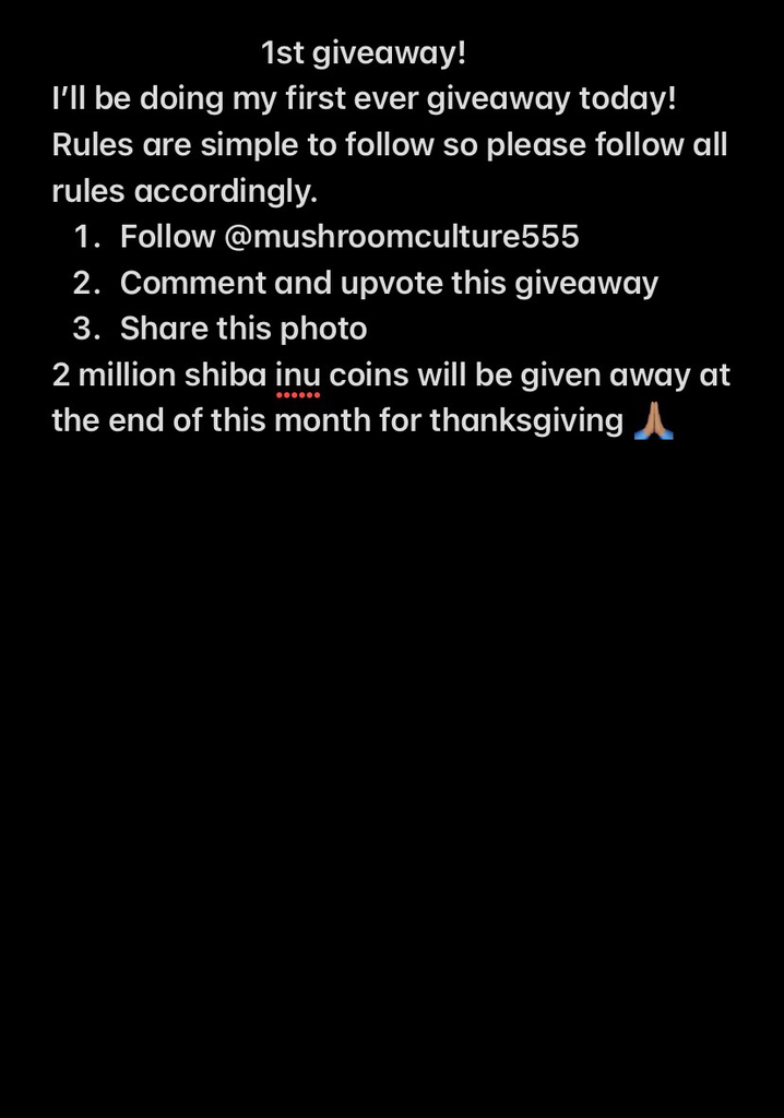 I love the mind’s community so much I wanna do my very first giveaway on here. The rules are simple. 2 million Shiba Inu coin’s will be given away at the end of thanksgiving for showing my appreciation to all you guy’s and Shiba Inu