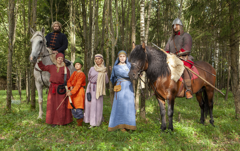 Stylized imagery of the Slavs of the 12th-13th centuries. From left to right: Citizen of Veliky Novgorod — Alexey Gavrilov Married woman (headdress — povoinik) — Marina Agafonova. Boy with bow and arrow — Alexander Dragun. Married woman from the Vyatichi tribe — Yulia Goroshko....See more
