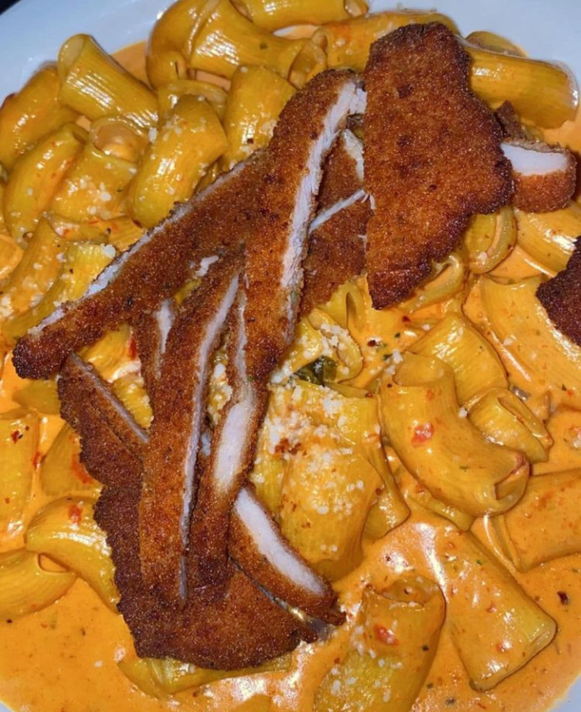 Spicy vodka pasta with chicken cutlet