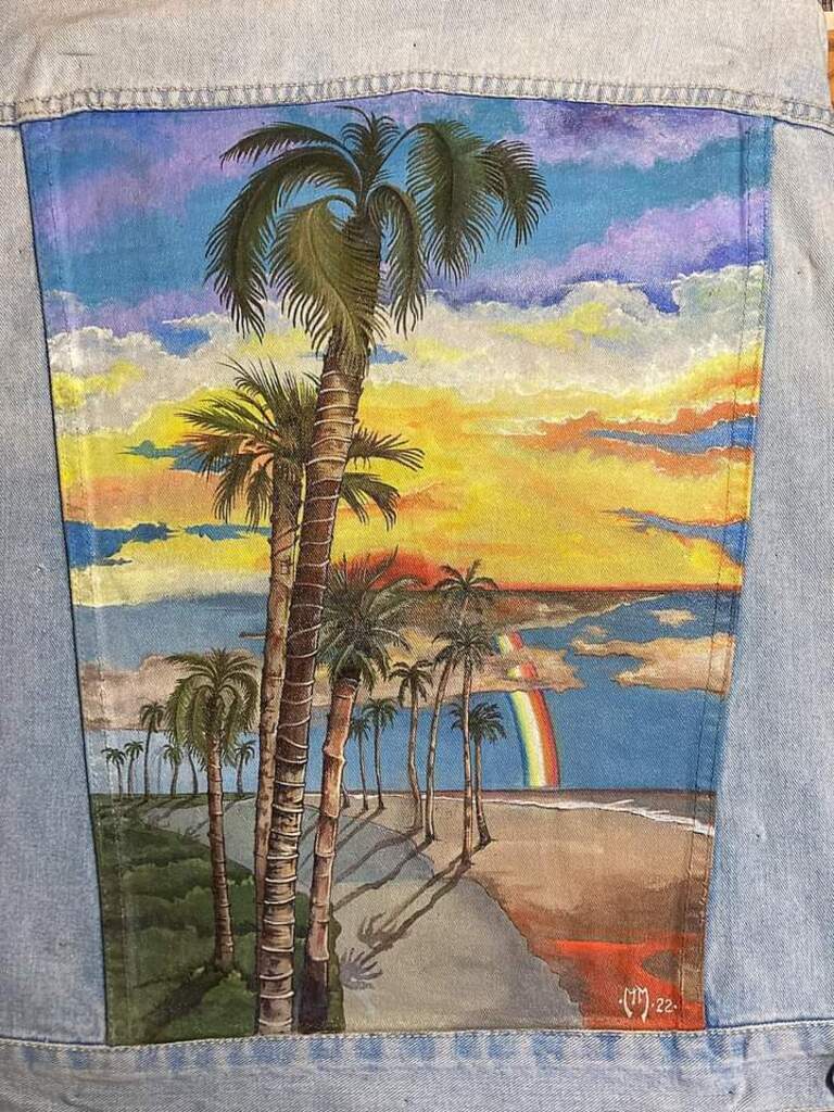 Acrylic on denim jacket The colors,the palm tree and the clouds are fantastic I love wearable art💗