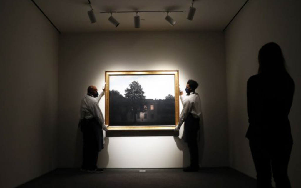 Workers hold 'L'empire des lumires' by Rene Magritte.which is on display at a media preview for Sotheby's Masters Week in New York City on Friday, January 21, 2022. Sotheby's Masters Week features a series of eight auctions encompassing Old Master paintings, drawings and sculpture by some of the most celebrated names in European art history. Photo by John Angelillo/UPI