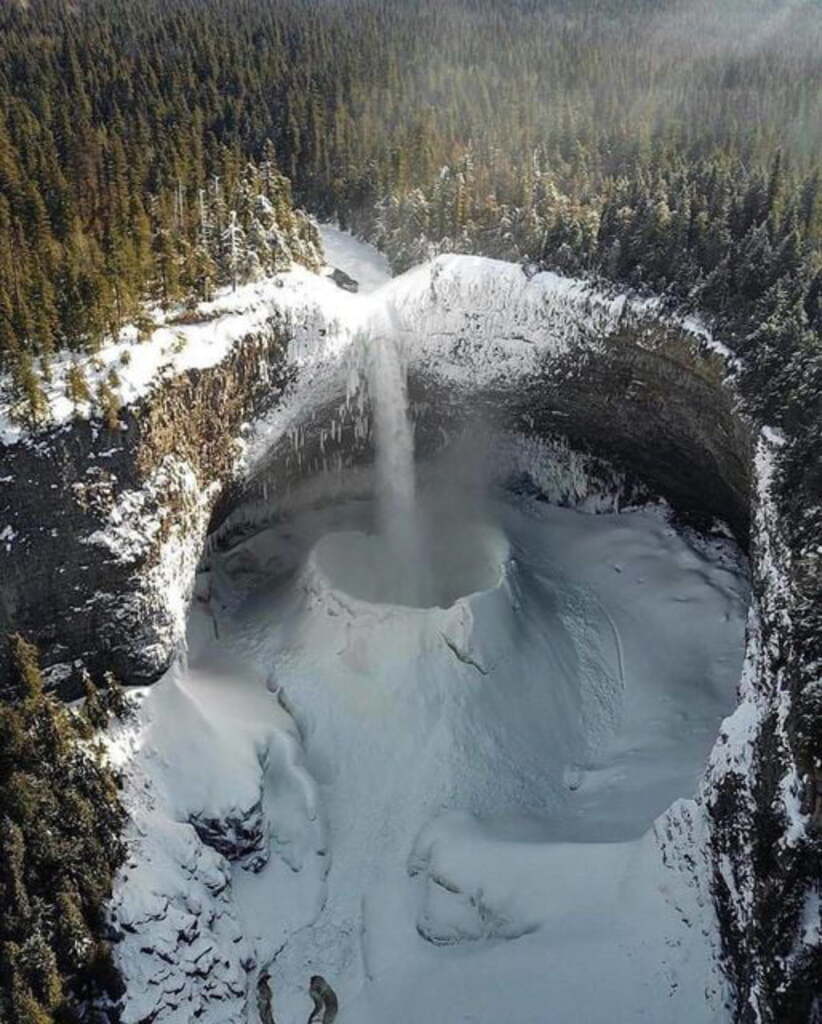 Freezing temperatures create the perfect environment for free-falling water to form a massive "ice crater" at the bottom of the falls (B.C.'s Helmcken Falls).