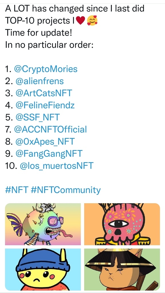 ...Time for update! In no particular order: 1. @CryptoMories 2. @alienfrens 3. @ArtCatsNFT 4. @FelineFiendz 5. @SSF_NFT 7. @ACCNFTOfficial 8. @0xApes_NFT 9. @FangGangNFT 10. @los_muertosNFT #NFT #NFTCommunity #nftart #art #nfts.