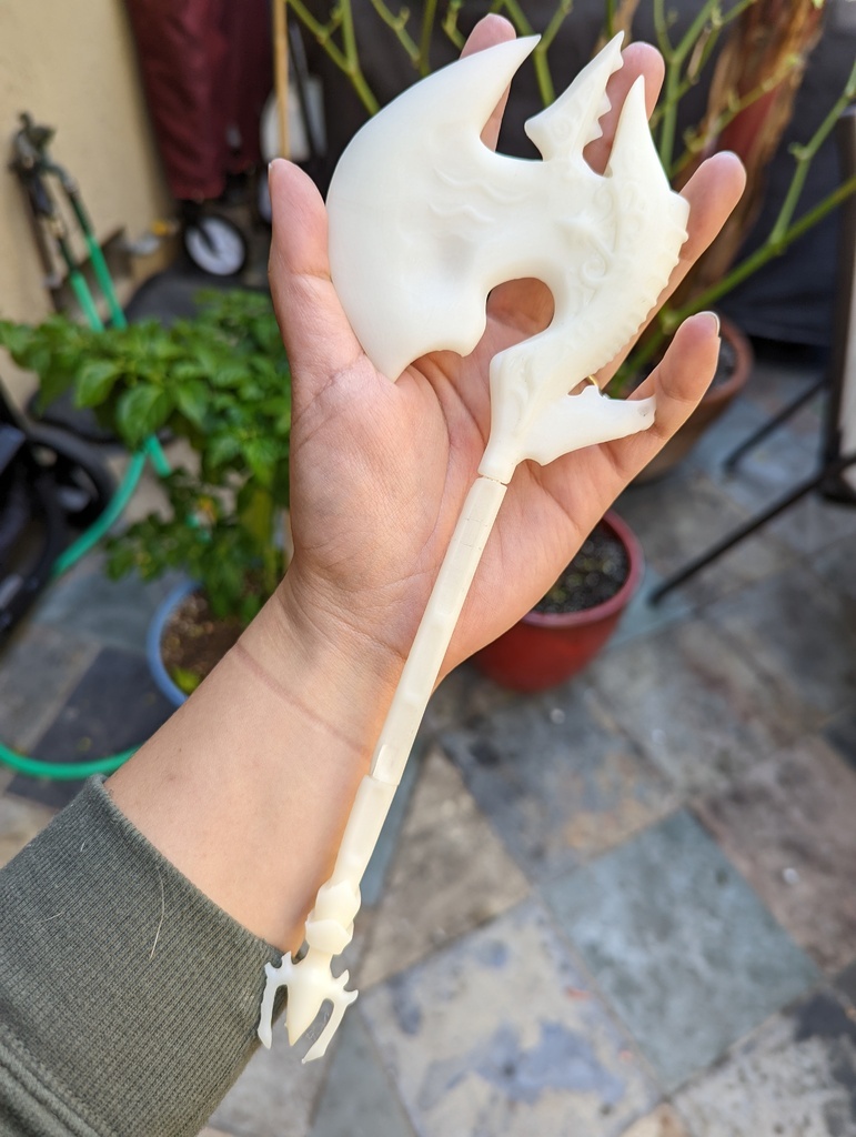 ...while! I modeled the warrior axe from FFXIV and printed it out. I need to go rework the file though as the middle piece came out warped. Not bad for a first draft!.