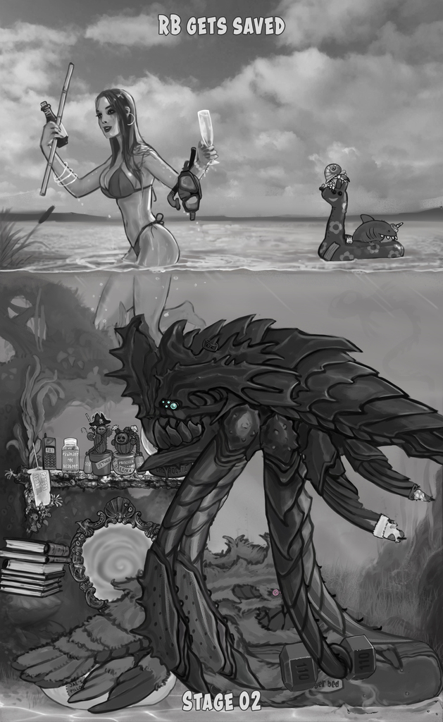 While Tomas is busy pumping iron and floating around like a big lump of poop, @jaebeeart decided to spare RB's life in true antient Roman manner. To prevent her from drowning, when she's about to crawl out of the pond and wonder off to another party, RB was given a breathing...See more