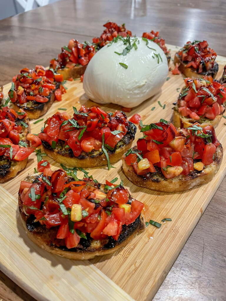 Bruschetta on grilled ciabatta with pesto and basil