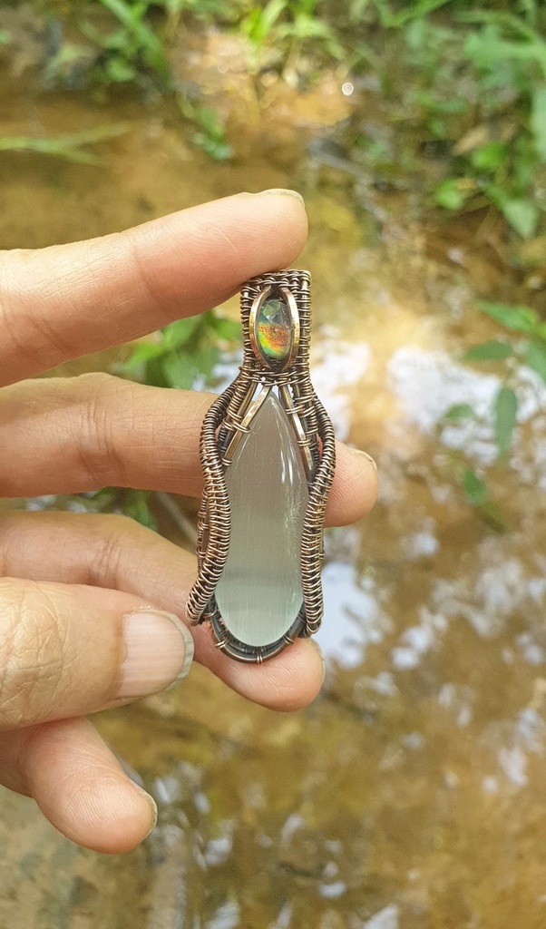 Moonstone Pendant accented with an Aurora Opal in Pure Copper Wire