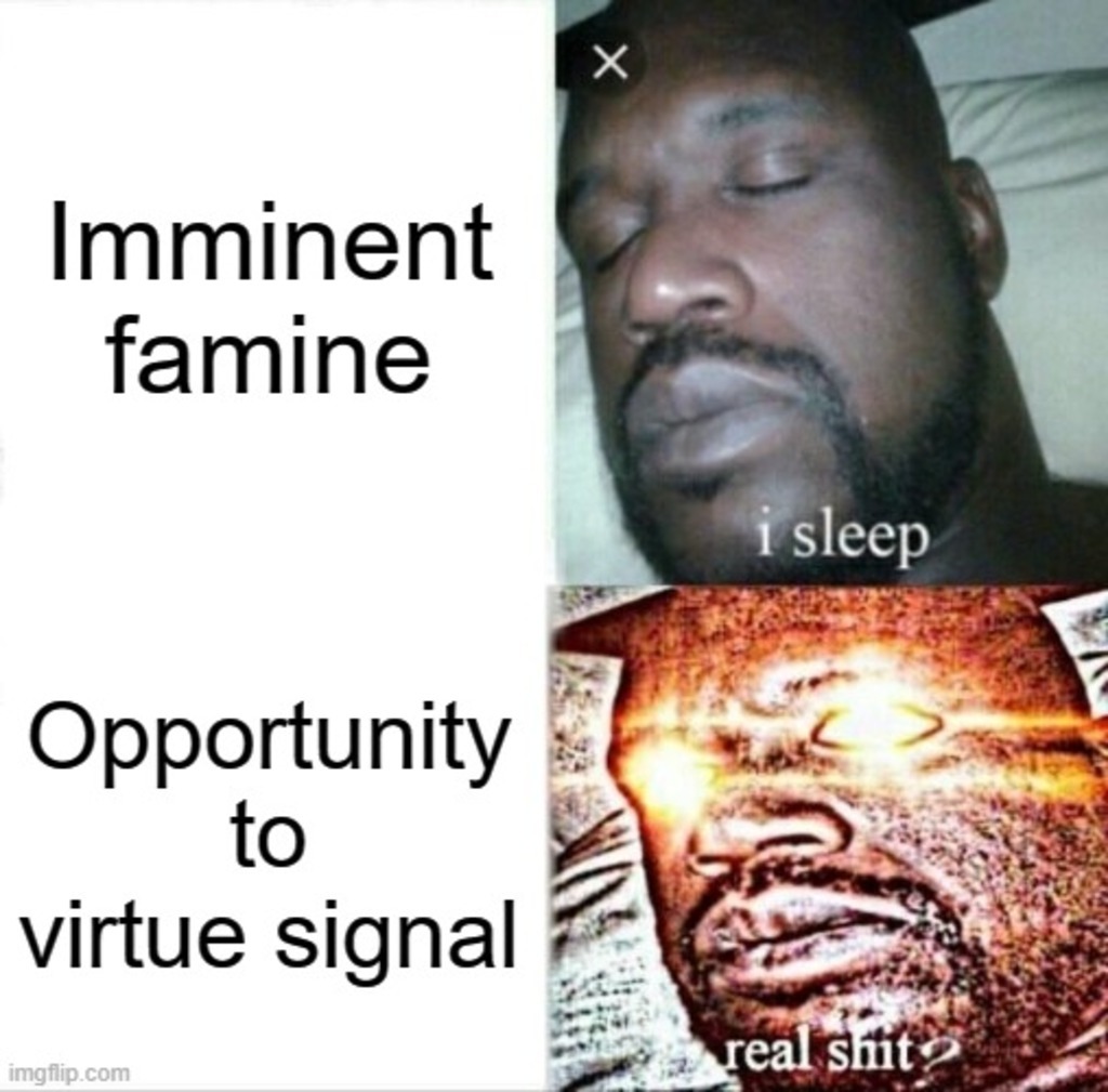 If people really cared about other people, they wouldn't be yelling about non-sequitur political platitudes while many will soon be going hungry.