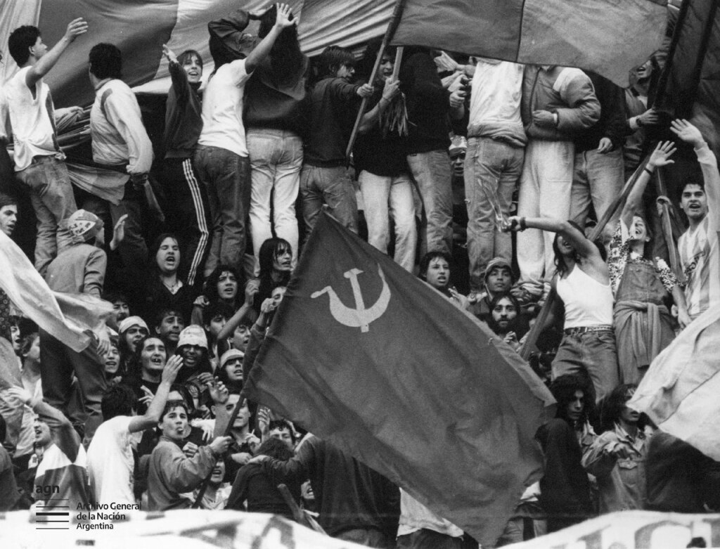 Boca Juniors' ultras at the superclásico vs River Plate, displaying a Soviet flag. The flag was stolen from USSR supporters at a 1990 World Cup match in Italy (a common "show of force" among Argentinian ultras), in one of their last international matches. Buenos Aires, Argentina, 1991