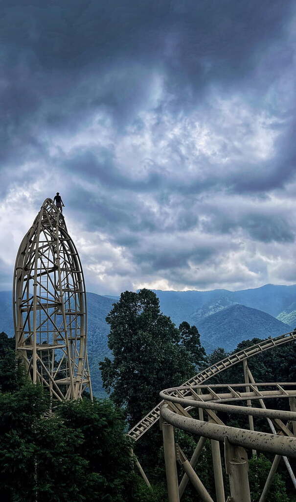 An abandoned roller coaster sitting in the mountains