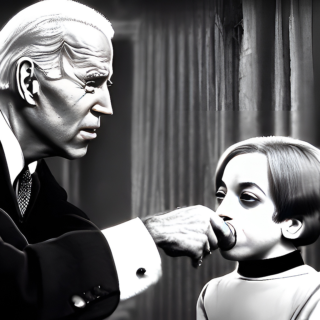 Not sure what the AI was thinking here but it's fitting in some way. Stable Diffusion Prompt: "Joe Biden as Lurch from the Addams Family sniffing a kid, Vintage, Ultra-HD, dark, Cinematic Lighting, decrepid, old, diseased"