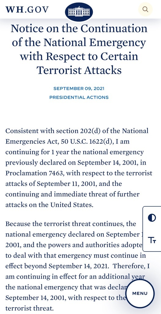 Biden continues emergency powers from 9/11