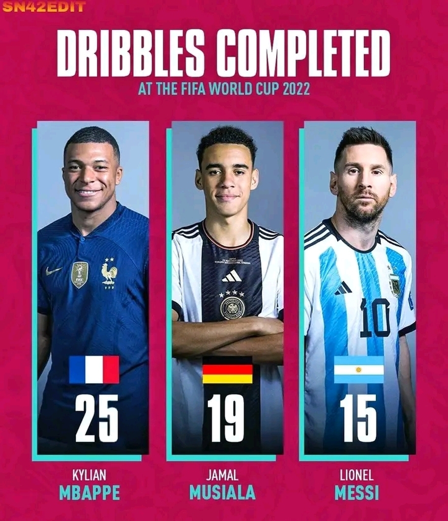 Complete Dribbles In This World Cup: • 25 - 🇫🇷 Kyllian Mbappe • 19 - 🇩🇪 Jamal Musiala • 15 - 🇦🇷 Leonel Messi Jamal Musiala The Exceptional Talent.💎