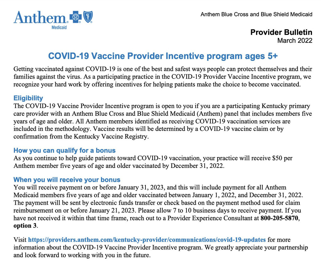 Dr RW Malone: Not only did physicians get bonuses for mass vaccination campaigns based on percentages of patients jabbed, they got an extra $50 per patient as an "incentive". "your practice will receive $50 per Anthem member five years of age and older vaccinated by December 31, 202