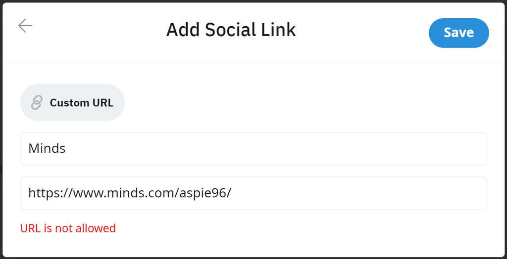 Trying to share my @minds profile on Reddit, in the section specifically designed for links. My Twitter/X link works, my custom link to my personal profile works. It's specifically the link to my Minds profile that is "not allowed".